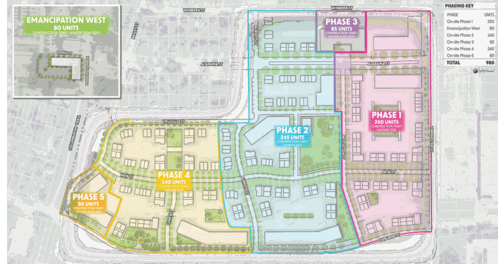 The map below shows where each construction phase will occur across the Cuney Homes site.